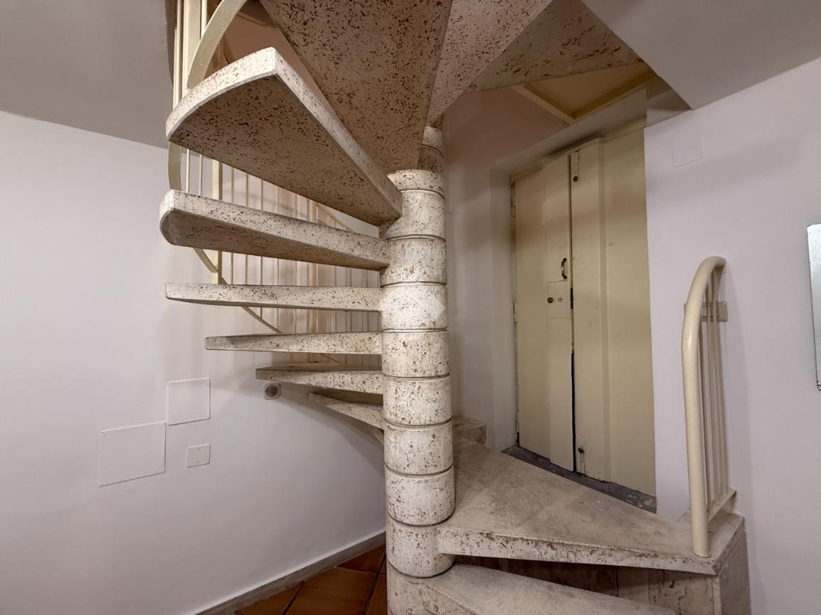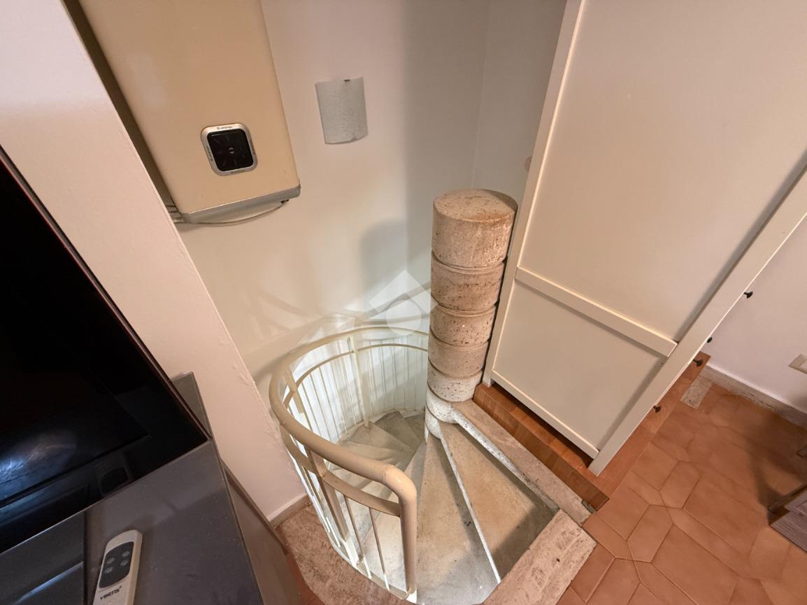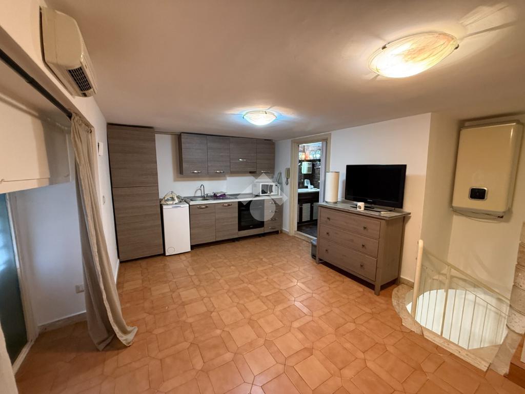 Tramite una scala a chiocciola interna si accede al piano superiore, dove si sviluppa un secondo ambiente composto da una comoda cucina, anch’essa dotata di finestra con affaccio esterno, e da un bagno completo di doccia, funzionale e ben distribuito.