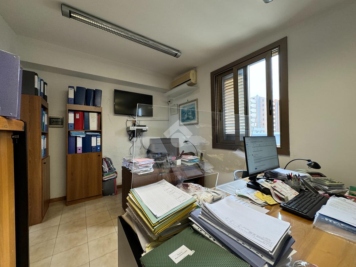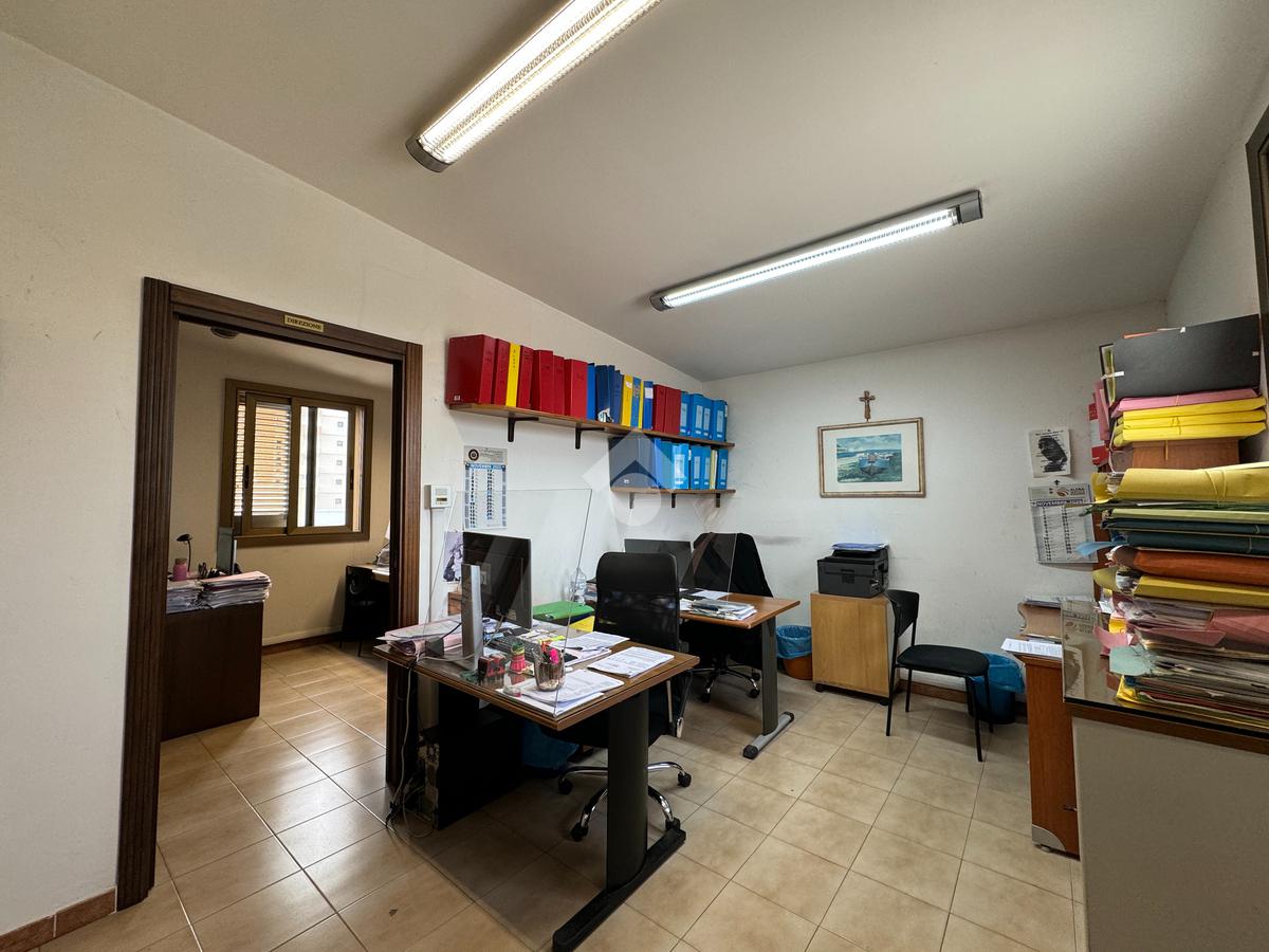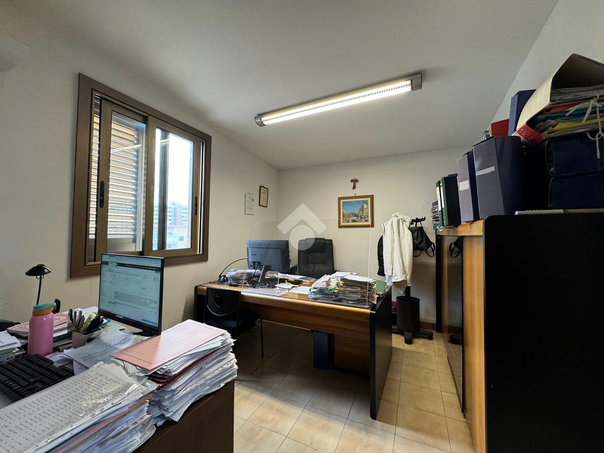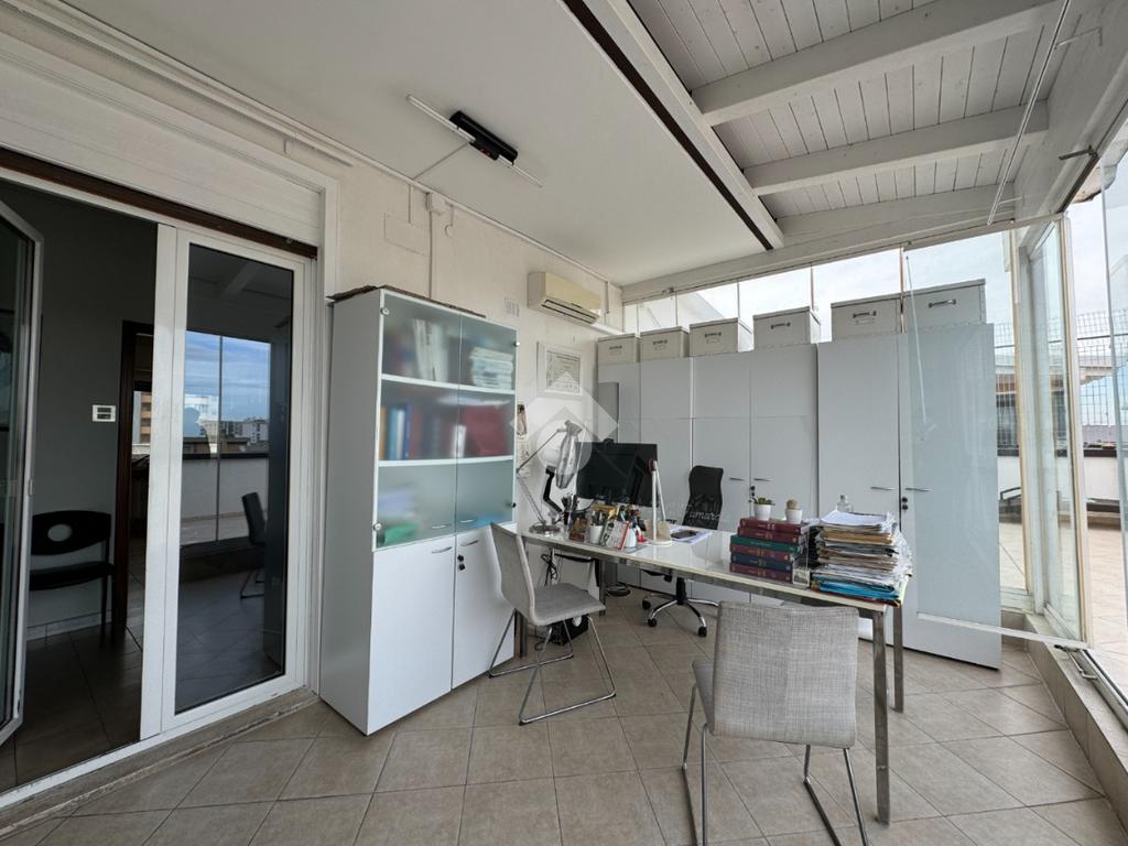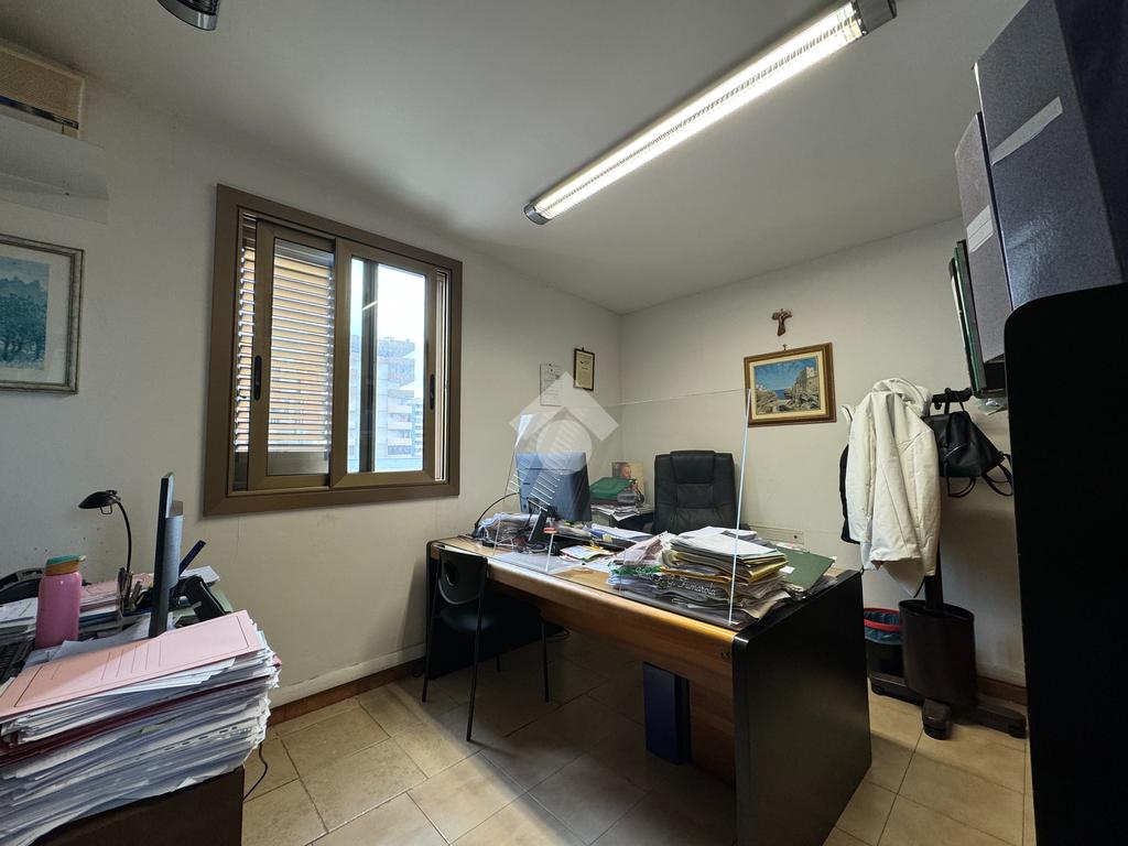 L’ingresso conduce immediatamente alla prima stanza, caratterizzata da ampie vetrate che conferiscono grande luminosità all’ambiente e che permettono l’accesso diretto a un ampio terrazzo, ideale come spazio esterno di rappresentanza o per momenti di pausa. Proseguendo lungo il corridoio si sviluppano ulteriori tre stanze, tutte finestrate e di generose dimensioni, attualmente adibite ad uso ufficio e perfettamente adattabili a diverse esigenze professionali.