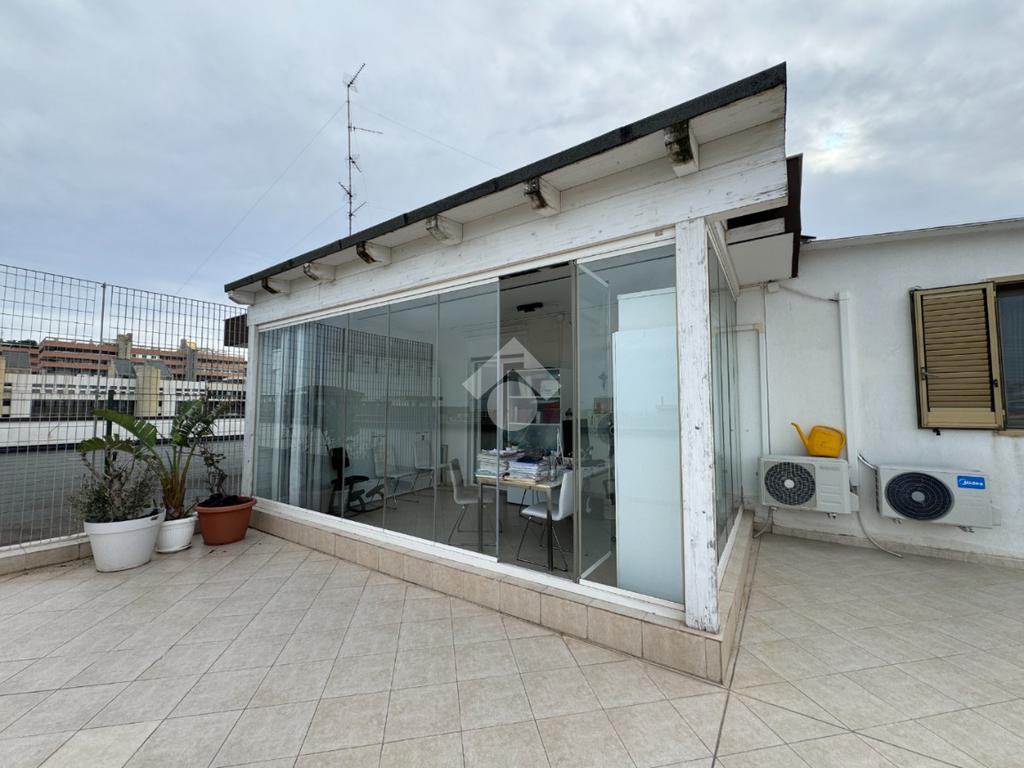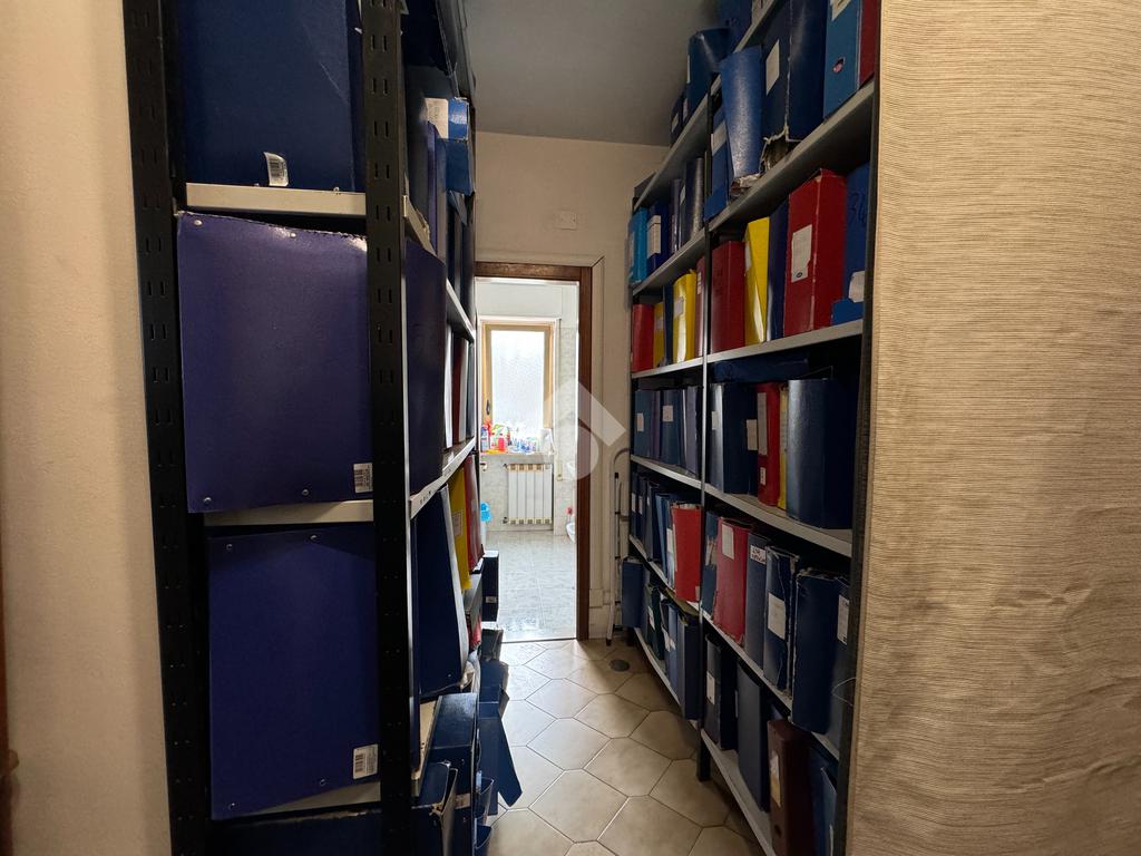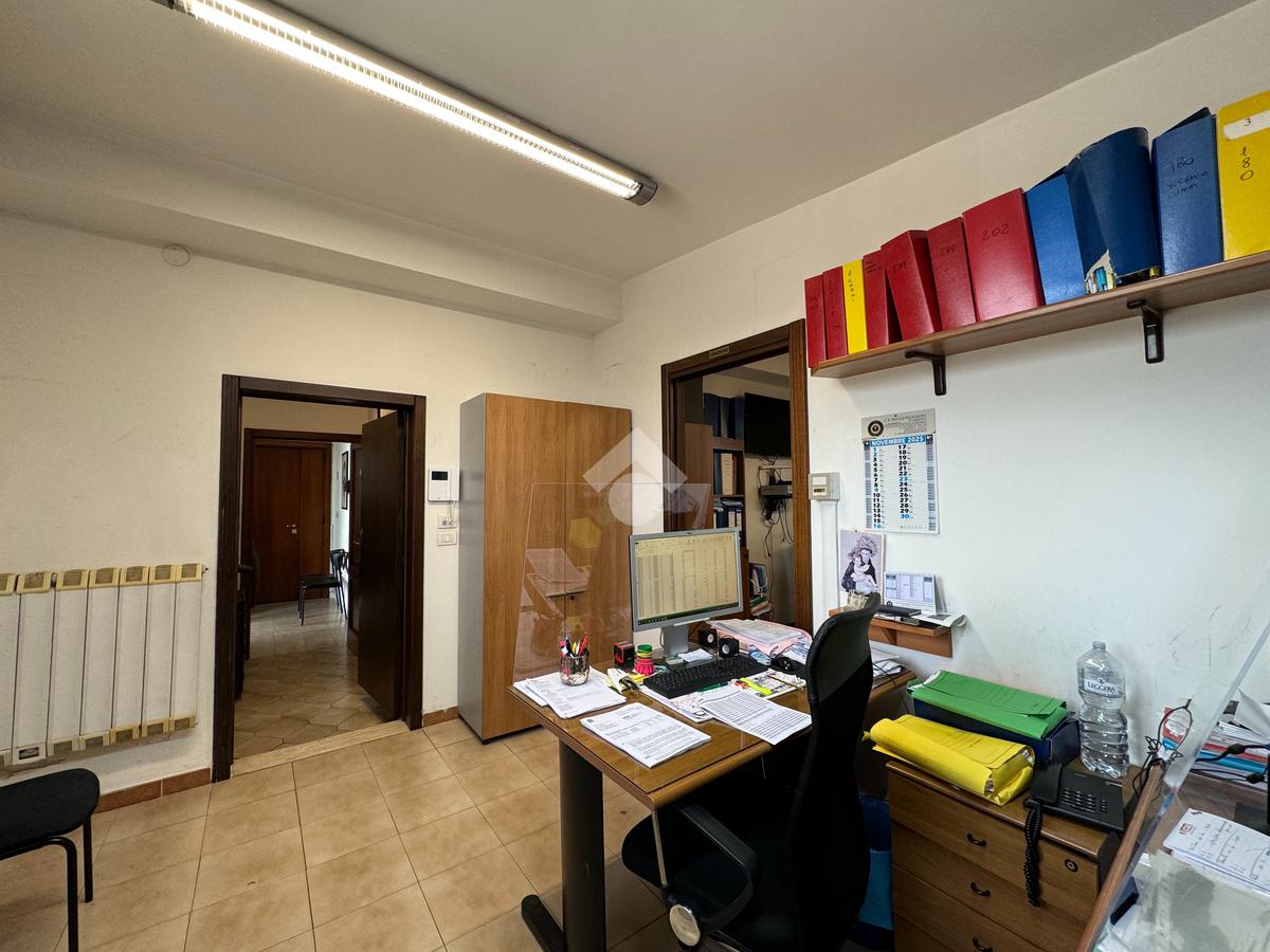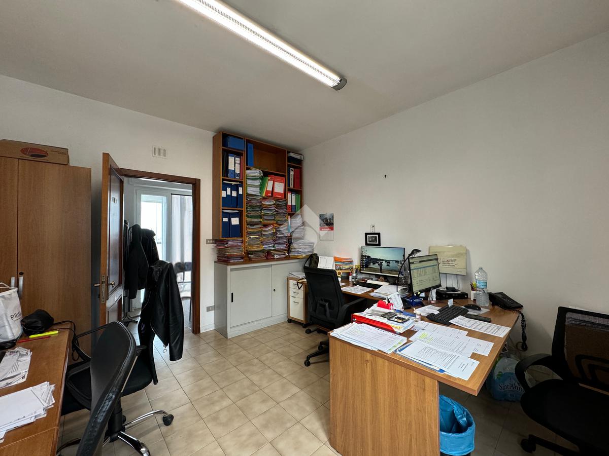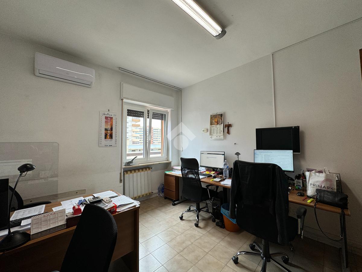 L’ingresso conduce immediatamente alla prima stanza, caratterizzata da ampie vetrate che conferiscono grande luminosità all’ambiente e che permettono l’accesso diretto a un ampio terrazzo, ideale come spazio esterno di rappresentanza o per momenti di pausa. Proseguendo lungo il corridoio si sviluppano ulteriori tre stanze, tutte finestrate e di generose dimensioni, attualmente adibite ad uso ufficio e perfettamente adattabili a diverse esigenze professionali.
