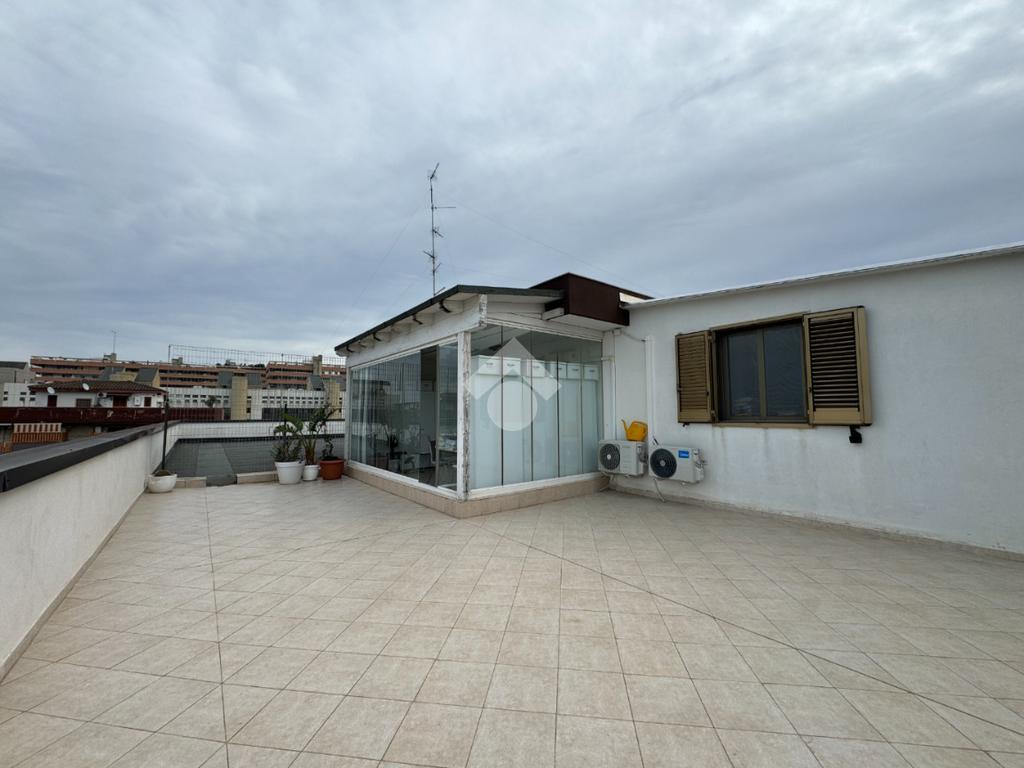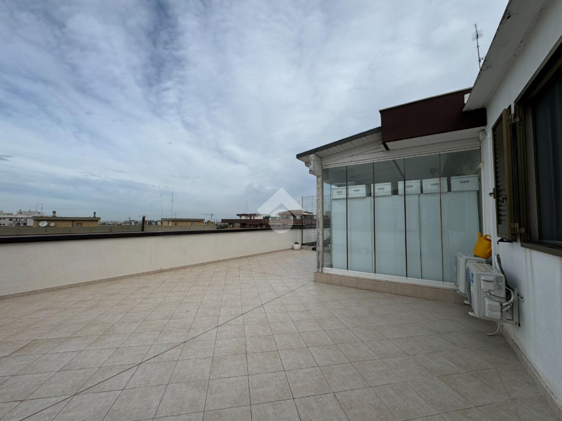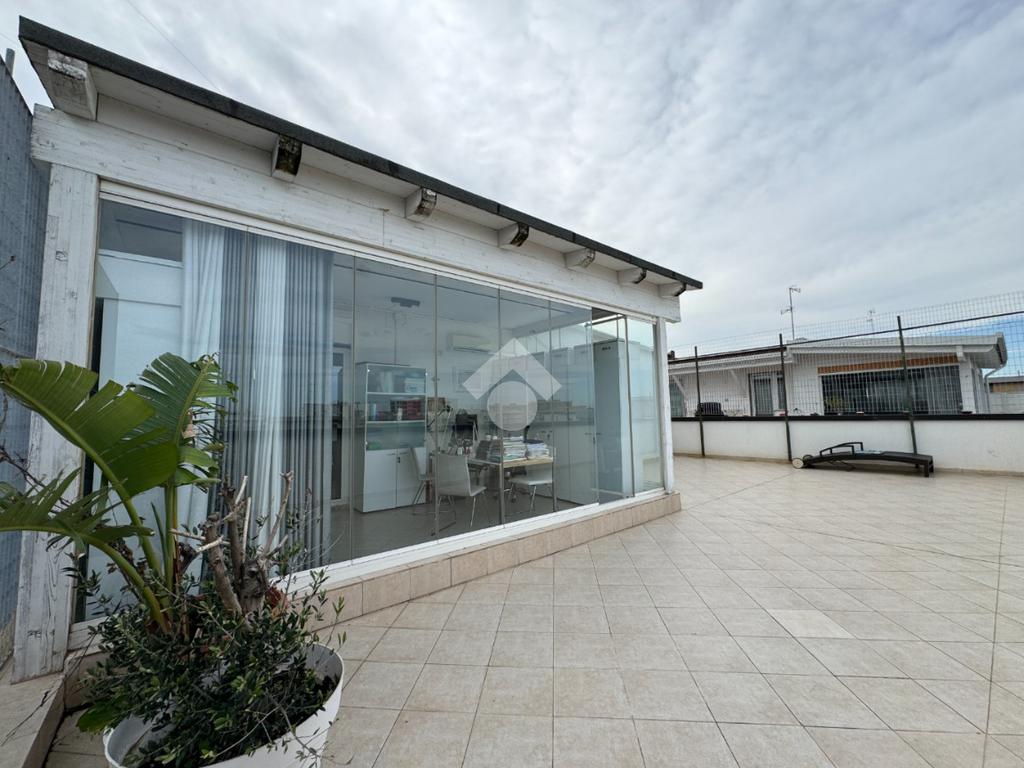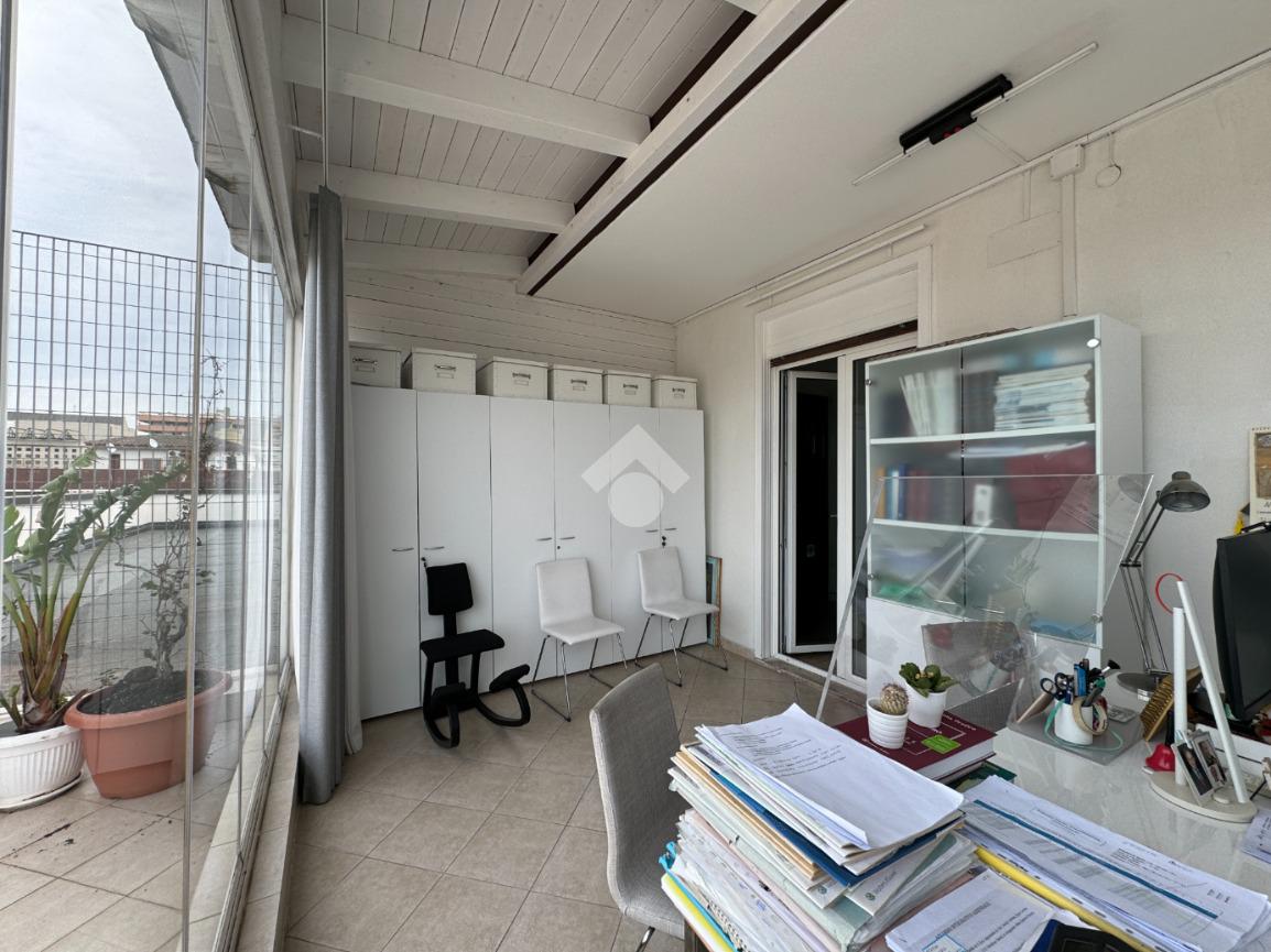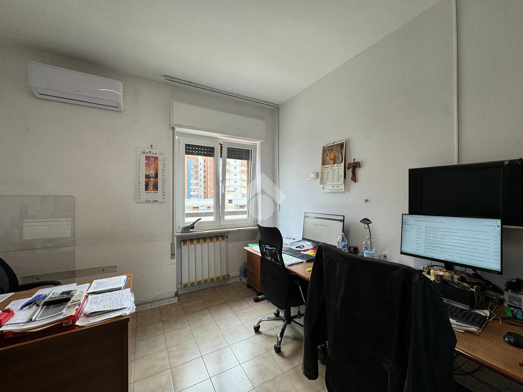L’ingresso conduce immediatamente alla prima stanza, caratterizzata da ampie vetrate che conferiscono grande luminosità all’ambiente e che permettono l’accesso diretto a un ampio terrazzo, ideale come spazio esterno di rappresentanza o per momenti di pausa. Proseguendo lungo il corridoio si sviluppano ulteriori tre stanze, tutte finestrate e di generose dimensioni, attualmente adibite ad uso ufficio e perfettamente adattabili a diverse esigenze professionali.