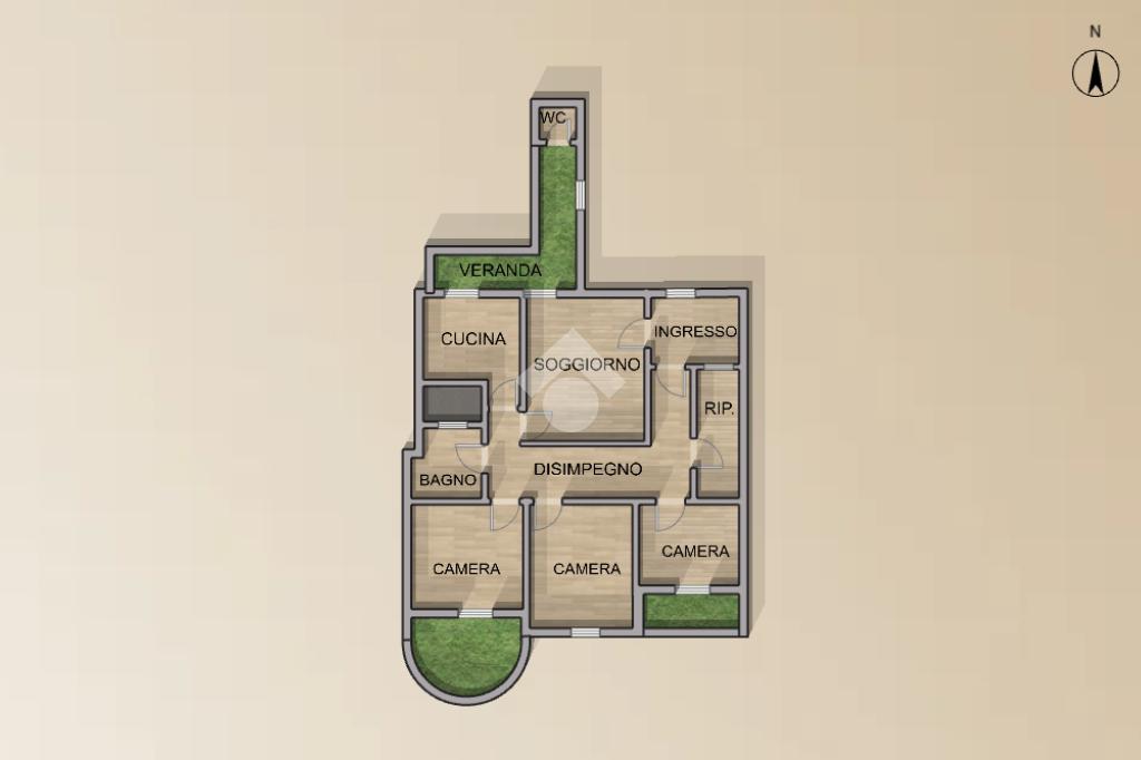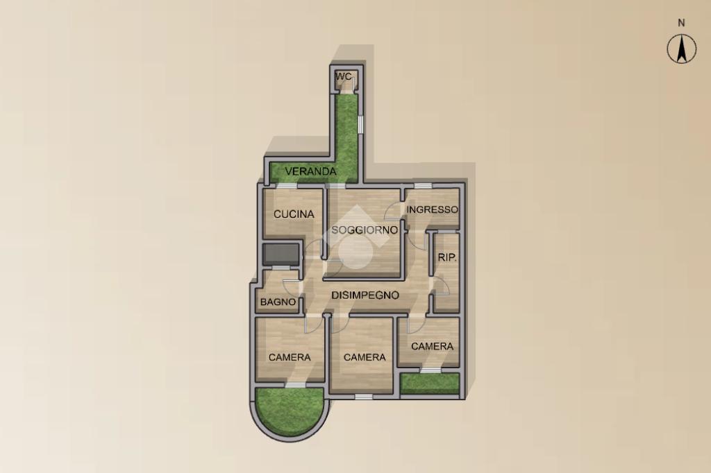 Adiacente al soggiorno si trova la cucina, anch’essa con affaccio sulla veranda interna. L’ambiente risulta particolarmente funzionale grazie alla presenza di due comodi ripostigli soppalcati, ideali per ottimizzare gli spazi e organizzare al meglio la casa.